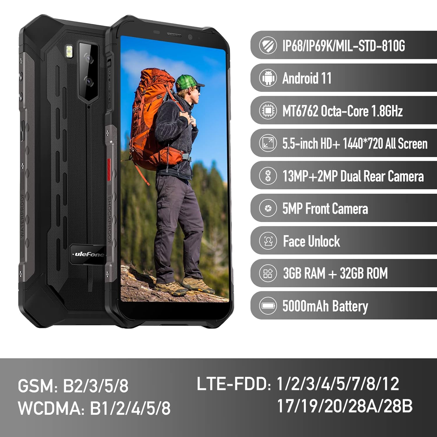 Figure 1: Ulefone Armor X9 Rugged Phone overview, highlighting its robust design and core specifications like IP68/IP69K rating, Android 11, Octa-Core processor, 5.5-inch HD+ screen, 13MP+2MP dual rear camera, 5MP front camera, Face Unlock, 3GB RAM + 32GB ROM, and 5000mAh battery.